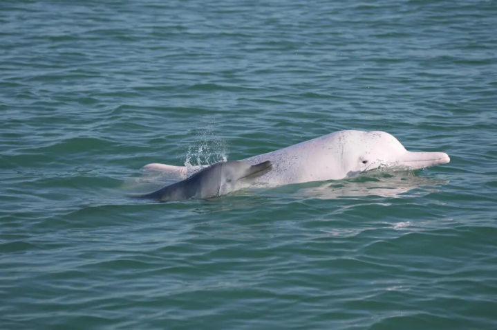 ▲白海豚姆妈带着一头海豚幼崽。图/红星新闻