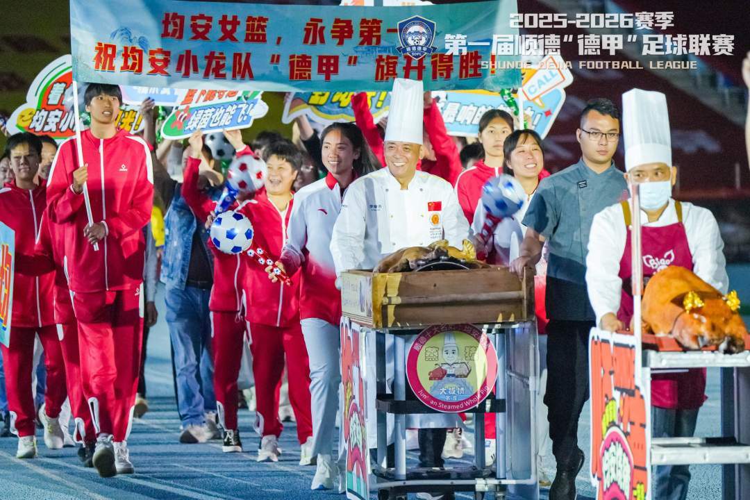 入场式一开动,现场的歧视就被瞬息拉满。勒流队推着油光锃亮的烧鹅抬头入场,那金黄酥脆的卖相引得不雅众席上一派高兴。均安队径直把镇街牌号蒸猪抬上绿茵场,轰轰烈烈。容桂38米紫龙舛错游动,伦教香云纱超脱优雅,陈村年桔东谈主偶憨态可掬,北滘家电东谈主偶科技感统统。乐从龙舟桨阵整都齐整,龙江舞龙与交响乐跨界混搭……每个镇街都在用我方最孤高的花样登场:大良以“中心城区”的气度,伦教以“硬金之坚与香云纱之韵”的刚柔并济,勒流以“五金产业”的底气,杏坛以“状元文化”的自信——十支军队,十种性格,拼出顺德的全貌。