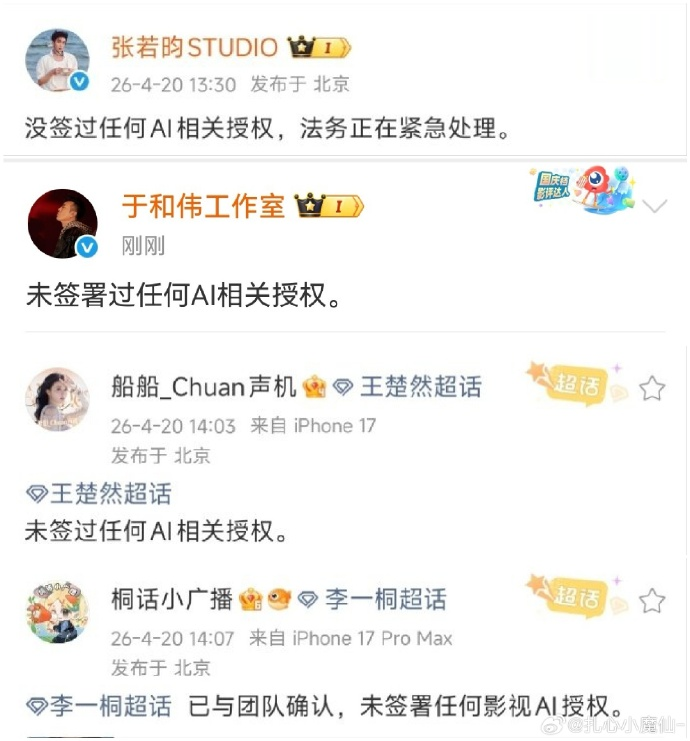 4月20日,演员张若昀使命室发布声明,称未签署过任何AI关系授权,法务正在广阔不停。