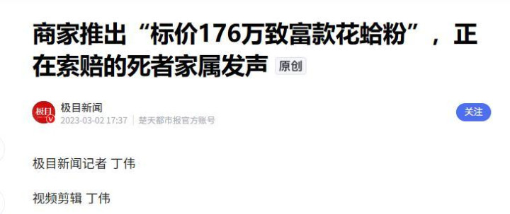 在电商平台上架一款花蛤粉,标价176万,而这个价钱,巧合是死者家属淡薄的索赔金额。