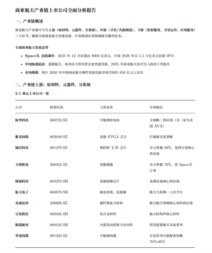 市场分析Agent:分析商业航天产业链上下游,拆解各环节价值链,给出投资机会指引;