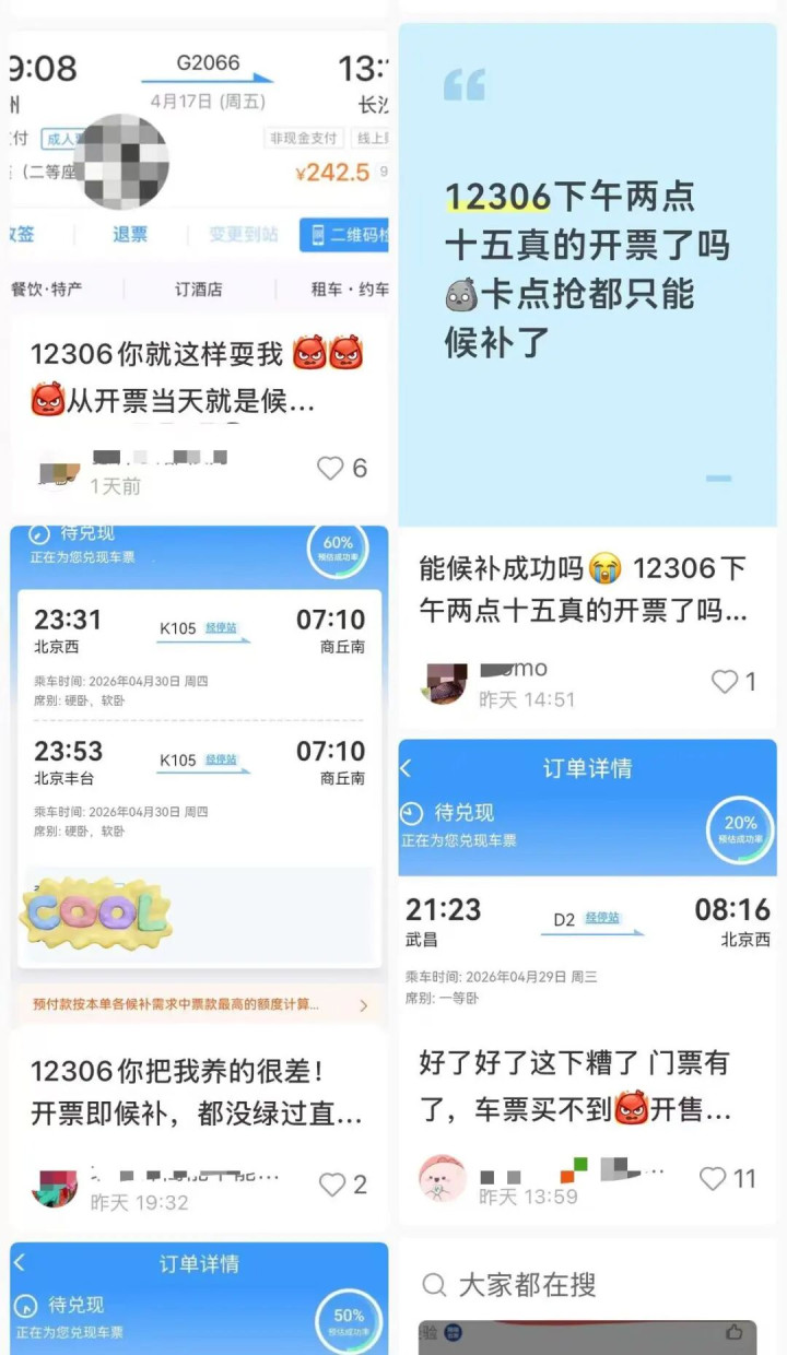 4月16日一早,中新经纬体验购买4月30日晚间北京发往广州南的火车票,固然提前预填了信息,但依旧开票即候补,选中的四条澄莹齐秒售罄。