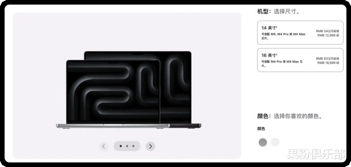 以 MacBook Pro 的选购页面为例,用户首先需要选择 14 英寸或 16 英寸,以及对应的机身配色。