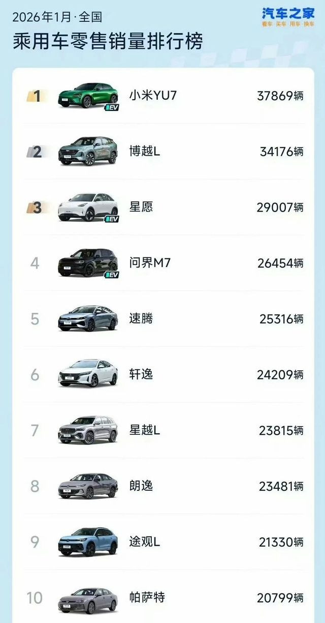 2026年1月更猛,小米卖了近4万辆,pk10官网新势力第二。关键是这技能SU7依然停产停售,这近4万辆险些全靠YU7一款车扛着——光YU7就孝敬了37869台。