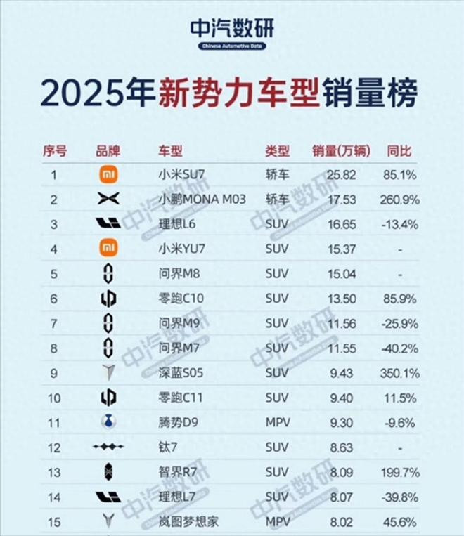 望望2025年的销量走势图,哪有什么受影响的表情?一皆蹭蹭往上窜,到年底凯旋干到月销5万多辆,杀进新势力前哨。小米SU7成了新势力的销冠,YU7才卖半年就排到第四。这收获,真有点笑傲江湖的道理了。