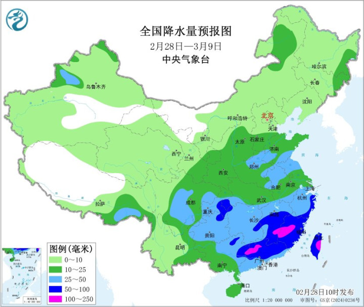 未来10天(2月28日-3月9日),华北南部、黄淮、江淮、江汉、江南、华南、西南地区东部及西藏东南部等地累计降水量有10~30毫米,其中江南南部、华南、贵州东北部等地有50~80毫米,局地100~130毫米;新疆北部、西北地区东部、华北北部、东北地区及内蒙古中东部等地降水量有3~8毫米,新疆伊犁河谷局地提高20毫米;上述大部地区降水量较终年同时偏多5成~1倍,局地偏多2倍以上。
