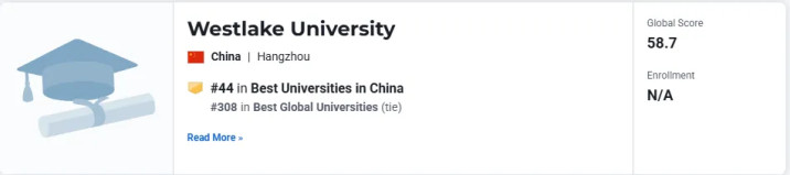 从国际榜单来看, 西湖大学的成绩也很显眼,U.S.News全球给了它308位, 是大陆高校第44名, 软科学术排名则把它列入全球301至400的范围, 对于一所2018年才获批的新校, 这个发展速度确实惊人。